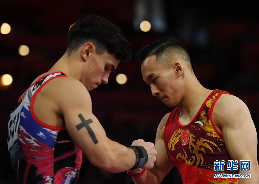 10月11日,中国选手肖若腾(右)在比赛中与俄罗斯选手达拉洛扬击掌致意。 当日,第49届世界体操锦标赛男子全能决赛在德国斯图加特举行,中国选手肖若腾以86.690分的总成绩获得第四名,孙炜以86.523分的总成绩获得第五名。 新华社记者 逯阳 摄