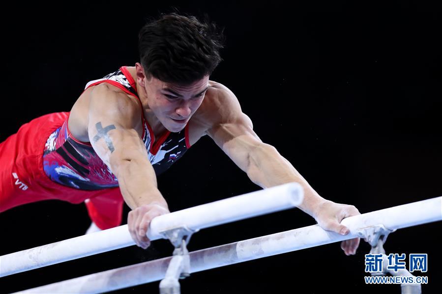 10月11日,俄罗斯选手达拉洛扬在双杠比赛中。 当日,第49届世界体操锦标赛男子全能决赛在德国斯图加特举行,俄罗斯选手纳戈尔内以88.772分的总成绩夺得冠军,达拉洛扬以87.165分的总成绩获得亚军。 新华社记者 张铖 摄