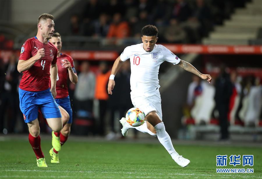 10月11日,英格兰队球员桑乔(右)在比赛中突破。 当日,在2020欧洲杯预选赛A组第七轮的比赛中,英格兰队客场以1比2不敌捷克队。 新华社/路透