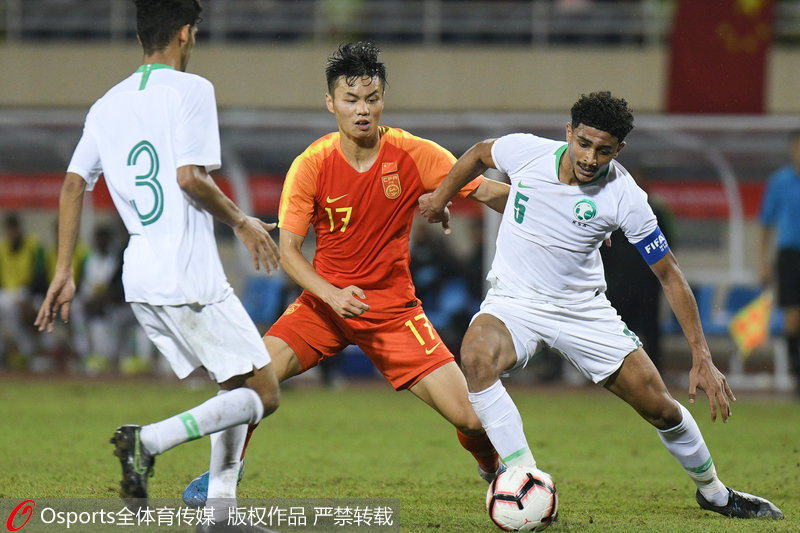 第37分钟,沙特队在右路再次形成威胁,面对段刘愚、张源和冯博轩的三人防守,沙特队过掉段刘愚后,再次穿裆冯博轩,一路带到禁区,最后一下打门被中国队封堵。