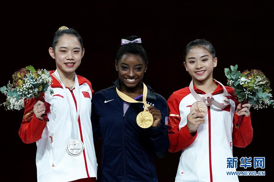 10月13日,亚军中国选手刘婷婷(左)、季军中国选手李诗佳(右)与冠军美国选手拜尔斯在颁奖仪式上合影。 当日,第49届世界体操锦标赛平衡木决赛在德国斯图加特举行。中国选手刘婷婷以14.433分的成绩获得亚军,中国选手李诗佳以14.300分的成绩获得季军,美国选手拜尔斯以15.066分的成绩获得冠军。 新华社记者 张铖 摄