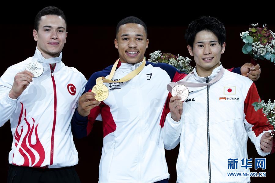10月13日,冠军英国选手弗雷泽(中)、亚军土耳其选手阿勒詹(左)以及季军日本选手萱和磨在颁奖仪式上合影。 当日,第49届世界体操锦标赛双杠决赛在德国斯图加特举行,英国选手弗雷泽以15.000的成绩获得冠军。 新华社记者 张铖 摄
