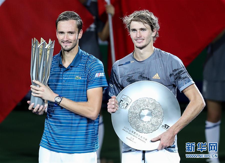 10月13日,俄罗斯选手梅德维德夫(左)与德国选手兹维列夫在颁奖仪式上。 当日,在2019年上海大师赛男子单打决赛中,俄罗斯选手梅德维德夫以2比0战胜德国选手亚历山大·兹维列夫,获得冠军。 新华社记者 吴刚 摄