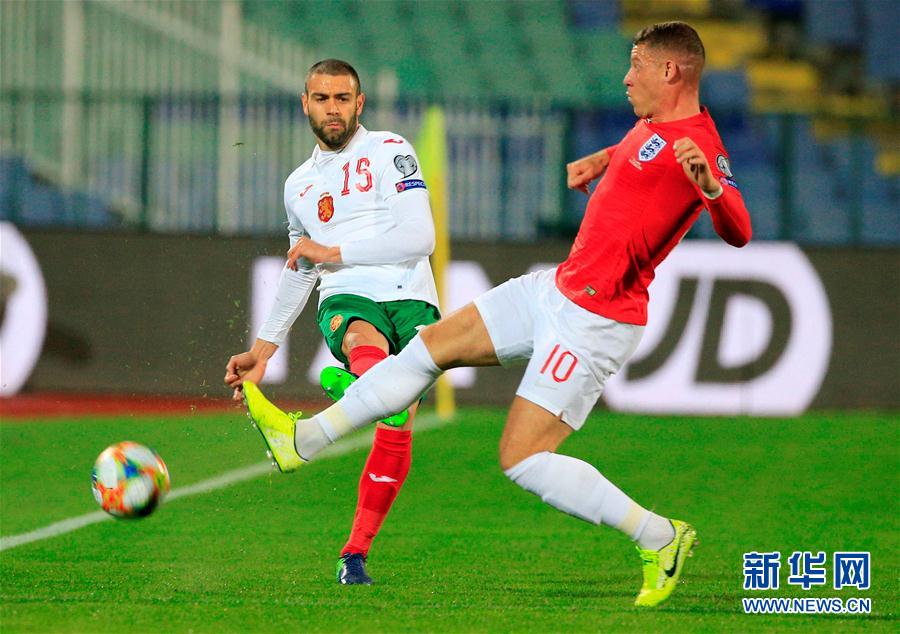 10月14日,英格兰队球员巴克利(右)在比赛中与保加利亚队球员特尔济耶夫拼抢。 当日,在2020年欧洲杯预选赛A组比赛中,英格兰队客场以6比0战胜保加利亚队。 新华社/路透
