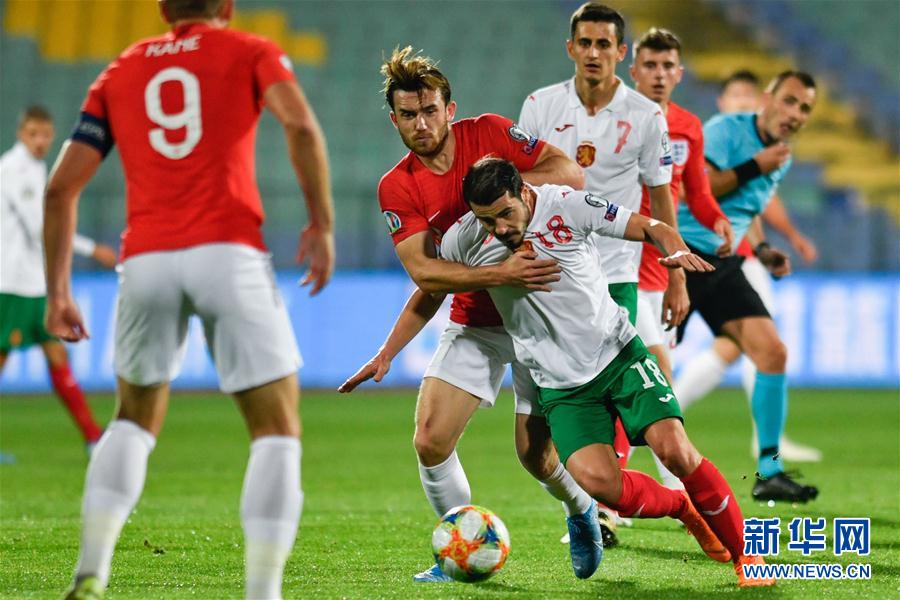 10月14日,英格兰队球员奇尔韦尔(左二)在比赛中与保加利亚队球员伊万诺夫(左三)拼抢。 当日,在2020年欧洲杯预选赛A组比赛中,英格兰队客场以6比0战胜保加利亚队。 新华社/法新