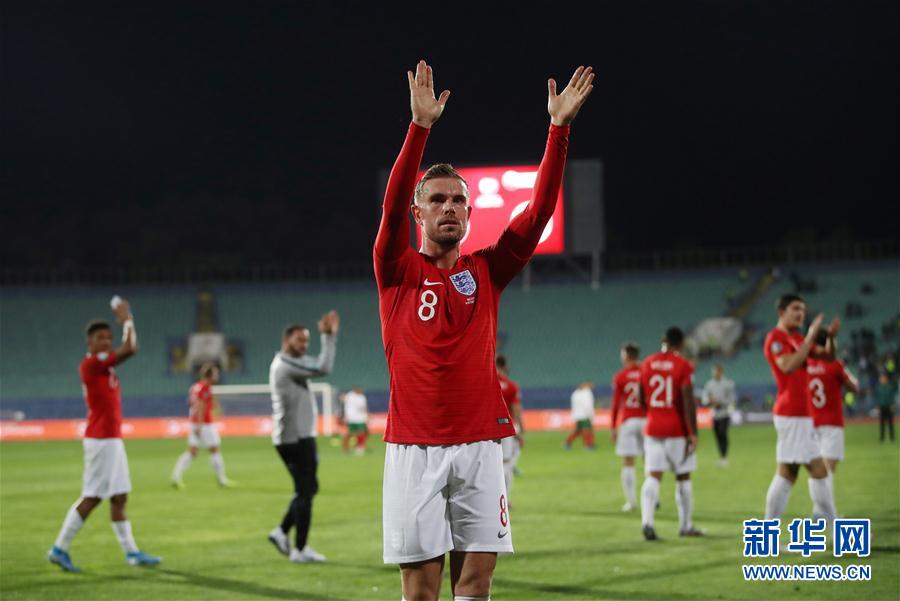 10月14日,英格兰队球员亨德森在比赛后向球迷致意。 当日,在2020年欧洲杯预选赛A组比赛中,英格兰队客场以6比0战胜保加利亚队。 新华社/路透