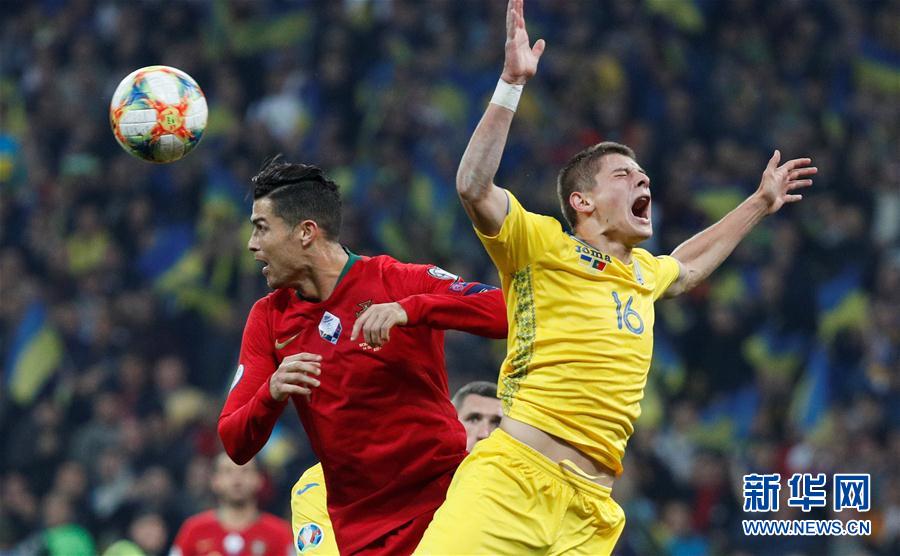 10月14日,葡萄牙队球员克·罗纳尔多(左)在比赛中与乌克兰队球员麦科连科争顶。 当日,在2020年欧洲杯预选赛B组比赛中,葡萄牙队客场以1比2不敌乌克兰队。 新华社/路透