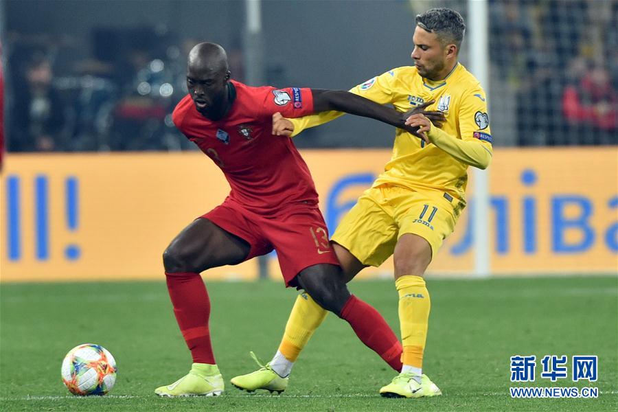 10月14日,葡萄牙队球员达尼洛(左)在比赛中与乌克兰队球员马洛斯拼抢。 当日,在2020年欧洲杯预选赛B组比赛中,葡萄牙队客场以1比2不敌乌克兰队。 新华社/法新