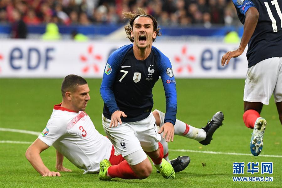 10月14日,法国队球员格列兹曼(上)与土耳其队球员德米拉尔(下)在比赛中拼抢倒地。 当日,在2020年欧洲杯预选赛H组比赛中,法国队主场以1比1战平土耳其队。 新华社/法新