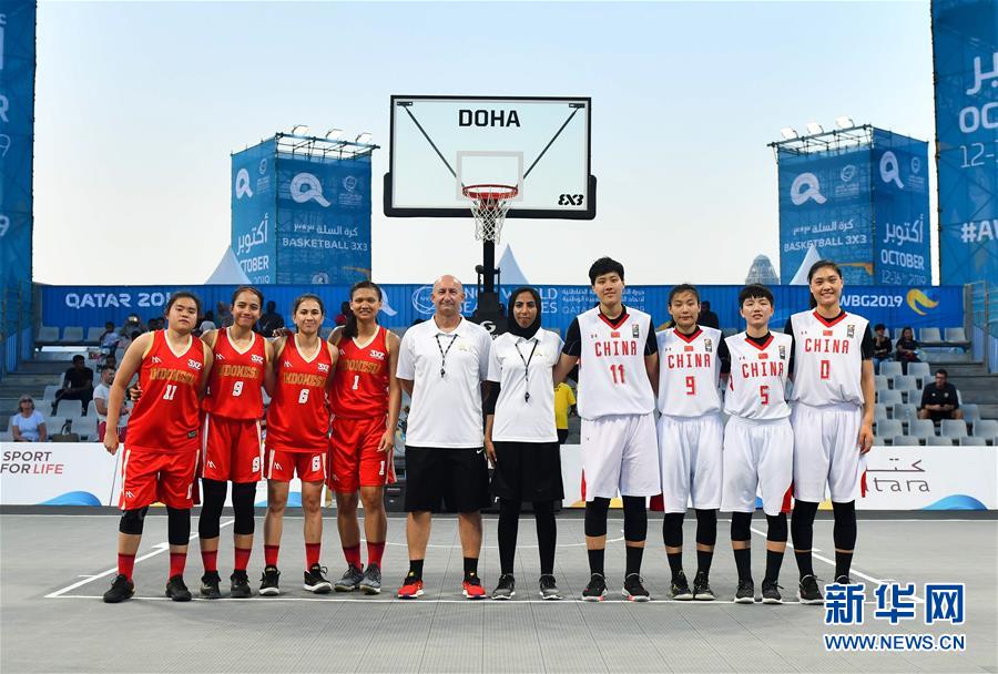 10月15日,中国队球员(右)和印度尼西亚球员(左)在比赛前与裁判合影。 当日,在卡塔尔首都多哈举行的首届世界沙滩运动会女子3X3沙滩篮球B组小组赛中,中国队以21比10战胜印度尼西亚队。 新华社发(尼库摄)