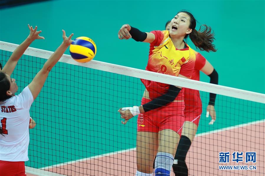 10月16日,中国队球员袁心玥(前右)在比赛中扣球。 新华社记者刘续摄
