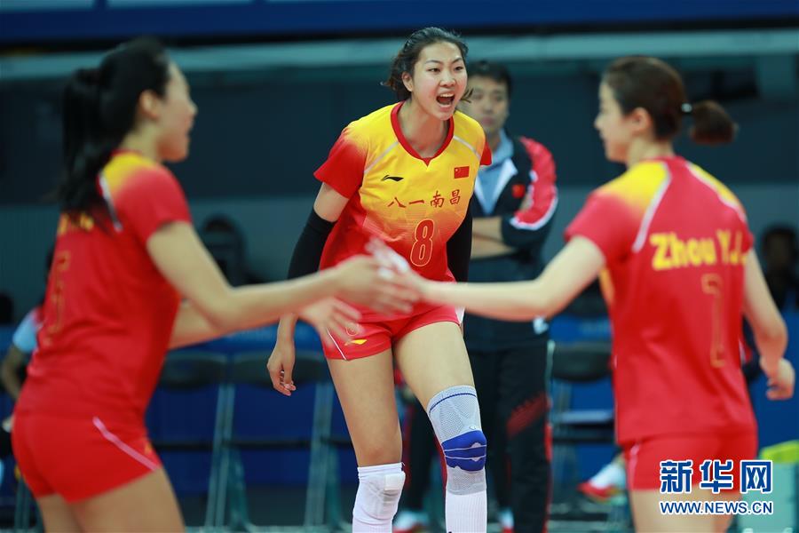 10月16日,中国队球员袁心玥(中)在比赛中庆祝得分。新华社记者刘续摄