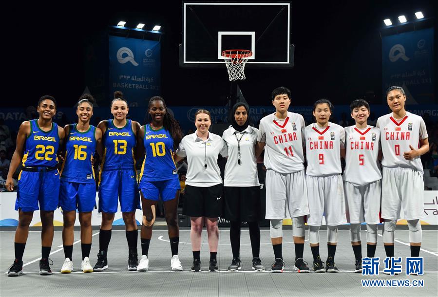 10月16日,中国队球员(右)和巴西队球员(左)在比赛前合影。 当日,在卡塔尔首都多哈举行的首届世界沙滩运动会女子3X3沙滩篮球三四名决赛中,中国队以17比13战胜巴西队,获得铜牌。 新华社发(尼库摄)