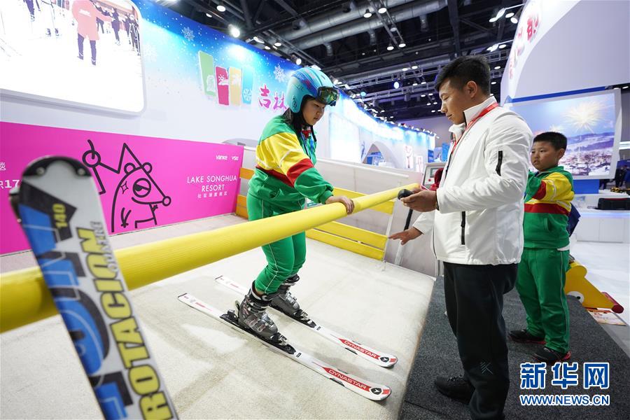 10月17日,一位小学生在吉林市展示区体验滑旱地滑雪设备。 当日,2019国际冬季运动(北京)博览会在北京国家会议中心开幕。本届冬博会延续“冰雪力量”的主题,在为期4天的冰雪盛宴中,通过展览展示、主论坛、平行论坛、产业交流、专场活动等形式,以多层次、全平台理念全面涵盖冰雪产业链,探讨中国冬季运动发展之路,推动我国冰雪产业发展。 新华社记者鞠焕宗摄
