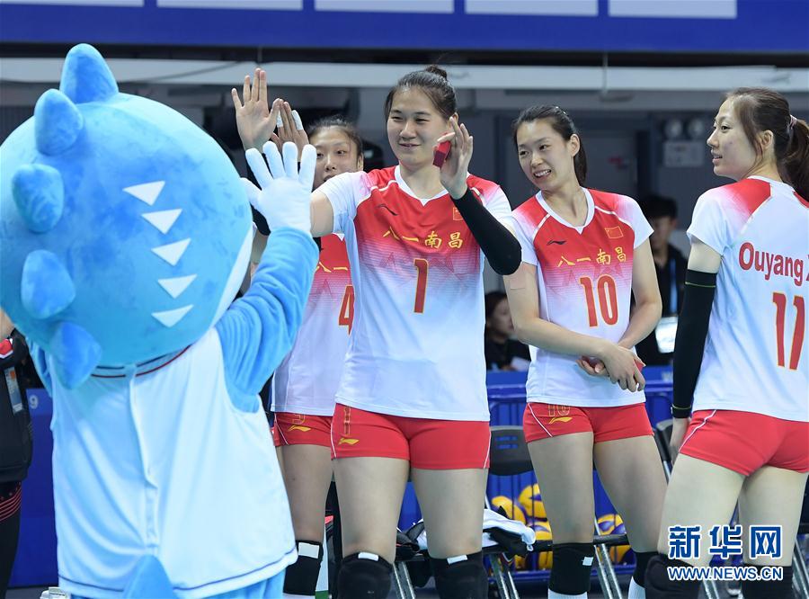 10月17日,中国队球员同吉祥物“兵兵”在赛场上互动。 当日,在武汉举行的第七届世界军人运动会女排小组赛A组第二轮比赛中,中国队以3比0战胜巴西队。 新华社记者李贺摄