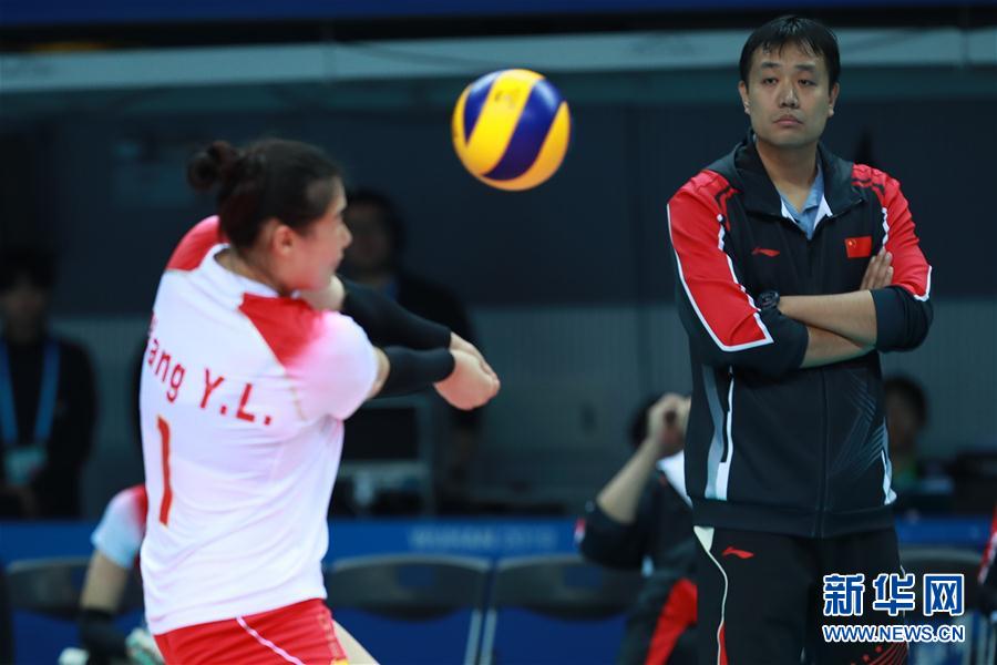 10月17日,中国队主教练武晓江(右)在场边观看比赛。当日,在武汉举行的第七届世界军人运动会女排小组赛A组第二轮比赛中,中国队以3比0战胜巴西队。新华社记者刘续摄