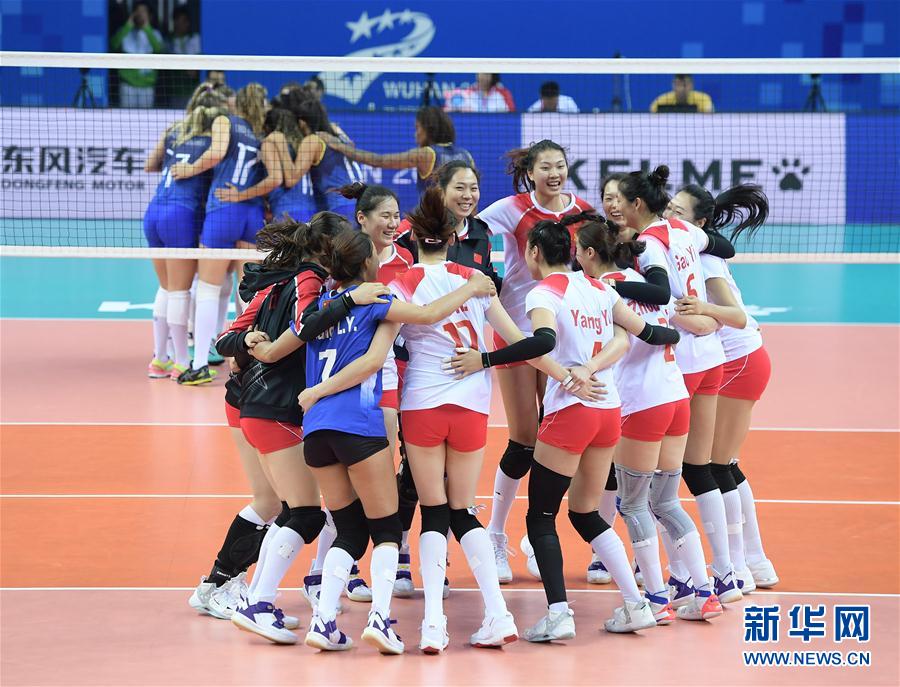 10月17日,中国队球员赛后庆祝获胜。当日,在武汉举行的第七届世界军人运动会女排小组赛A组第二轮比赛中,中国队以3比0战胜巴西队。 新华社记者李贺摄