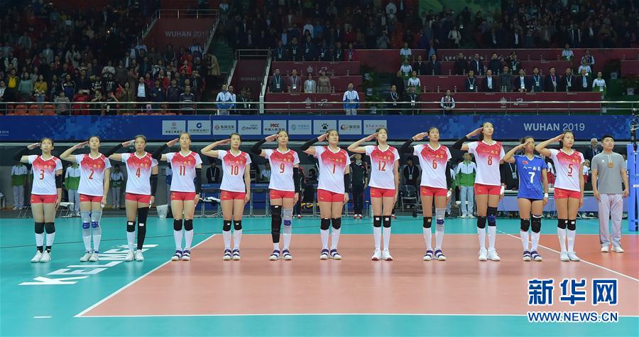 10月17日,中国队球员在出场仪式上向国旗敬礼。当日,在武汉举行的第七届世界军人运动会女排小组赛A组第二轮比赛中,中国队以3比0战胜巴西队。新华社记者李贺摄