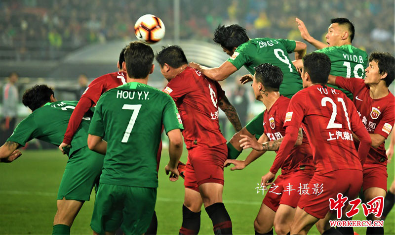 2019年10月19日晚,北京工人体育场,中超联赛第26轮比赛,北京中赫国安主场0比2负于上海上港。上半场上港队胡尔克曾击中国安球门立柱,比赛第49分钟,李圣龙在吕文君助攻下头球破门,第66分钟,上港打出教科书般反击,艾哈迈多夫单刀球破门。中超争冠上港反超国安1分,以59分排名积分榜第2位,落后榜首恒大3分。图为双方的比赛。工人日报-中工网许之丰摄影报道