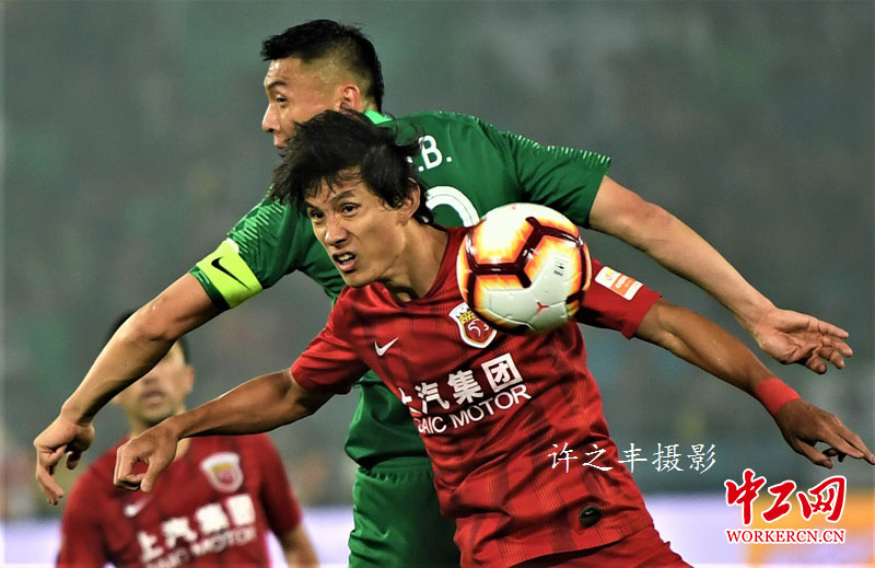 2019年10月19日晚,北京工人体育场,中超联赛第26轮比赛,北京中赫国安主场0比2负于上海上港。上半场上港队胡尔克曾击中国安球门立柱,比赛第49分钟,李圣龙在吕文君助攻下头球破门,第66分钟,上港打出教科书般反击,艾哈迈多夫单刀球破门。中超争冠上港反超国安1分,以59分排名积分榜第2位,落后榜首恒大3分。图为双方的比赛。工人日报-中工网许之丰摄影报道