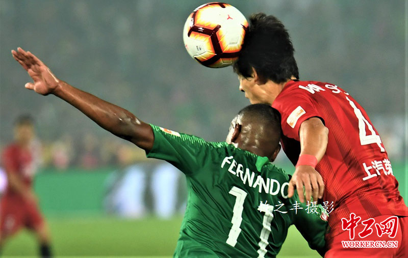 2019年10月19日晚,北京工人体育场,中超联赛第26轮比赛,北京中赫国安主场0比2负于上海上港。上半场上港队胡尔克曾击中国安球门立柱,比赛第49分钟,李圣龙在吕文君助攻下头球破门,第66分钟,上港打出教科书般反击,艾哈迈多夫单刀球破门。中超争冠上港反超国安1分,以59分排名积分榜第2位,落后榜首恒大3分。图为双方的比赛。工人日报-中工网许之丰摄影报道
