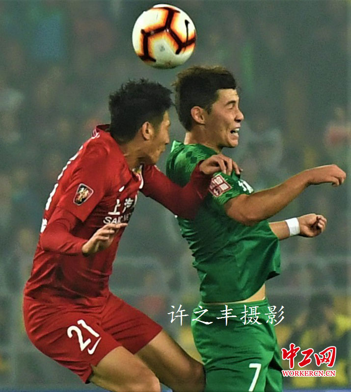 2019年10月19日晚,北京工人体育场,中超联赛第26轮比赛,北京中赫国安主场0比2负于上海上港。上半场上港队胡尔克曾击中国安球门立柱,比赛第49分钟,李圣龙在吕文君助攻下头球破门,第66分钟,上港打出教科书般反击,艾哈迈多夫单刀球破门。中超争冠上港反超国安1分,以59分排名积分榜第2位,落后榜首恒大3分。图为双方的比赛。工人日报-中工网许之丰摄影报道