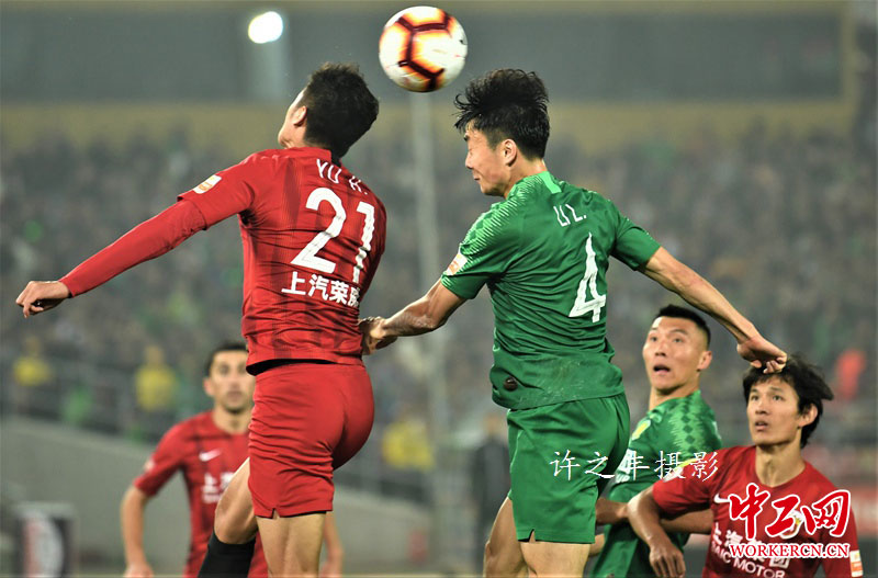 2019年10月19日晚,北京工人体育场,中超联赛第26轮比赛,北京中赫国安主场0比2负于上海上港。上半场上港队胡尔克曾击中国安球门立柱,比赛第49分钟,李圣龙在吕文君助攻下头球破门,第66分钟,上港打出教科书般反击,艾哈迈多夫单刀球破门。中超争冠上港反超国安1分,以59分排名积分榜第2位,落后榜首恒大3分。图为双方的比赛。工人日报-中工网许之丰摄影报道