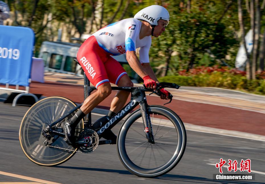 10月19日,第七届世界军人运动会公路自行车男子个人计时赛决赛在武汉市东湖绿道公路自行车场地举行,俄罗斯选手洛比耶夫·安东夺得金牌,奥地利选手甘佩尔·帕特里克·曼弗雷德夺得银牌,法国选手卡伯特·杰瑞米夺得铜牌。图为俄罗斯选手洛比耶夫·安东比赛中。 中新社记者 张畅 摄