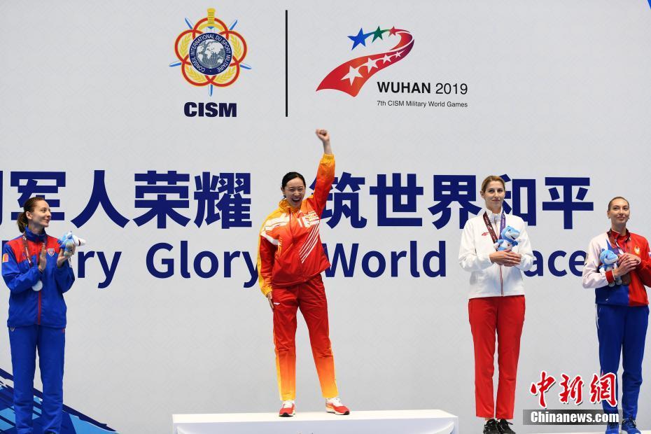 10月19日,第七届世界军人运动会击剑比赛,中国选手孙一文以11:10的成绩战胜罗马尼亚选手波佩斯库·玛利亚·弗洛伦蒂娜,获得女子个人重剑冠军。图为颁奖仪式现场。 中新社记者 周毅 摄