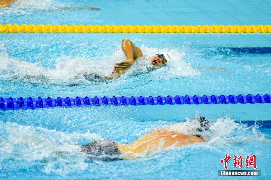 10月19日,第七届世界军人运动会游泳比赛男子4×200米自由泳接力决赛在湖北省武汉市举行,汪顺、刘绍烽、何峻毅和季新杰组成的中国队以7分13秒35的成绩夺得冠军,并打破国际军事体育理事会纪录。图为中国队第一棒汪顺在比赛中。中新社记者 何蓬磊 摄