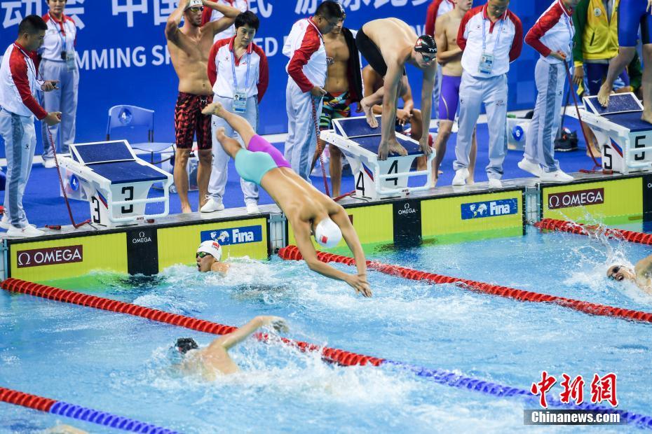 10月19日,第七届世界军人运动会游泳比赛男子4×200米自由泳接力决赛在湖北省武汉市举行,汪顺、刘绍烽、何峻毅和季新杰组成的中国队以7分13秒35的成绩夺得冠军,并打破国际军事体育理事会纪录。图为中国队第一棒汪顺和第二棒刘绍烽在比赛中交接棒。中新社记者 何蓬磊 摄