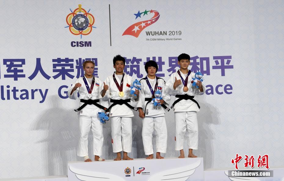 10月19日,第七届世界军运会女子48公斤级柔道决赛中,中国选手陈晨战胜俄罗斯选手多尔戈娃·伊里娜获得金牌。图为颁奖仪式。中新社记者 安源 摄
