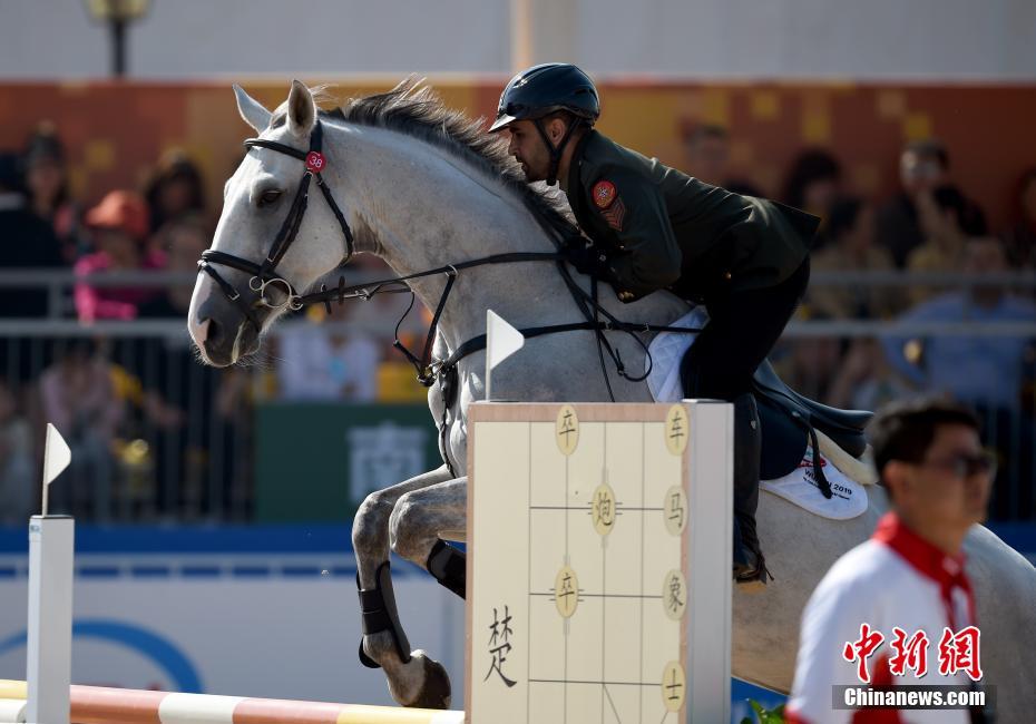10月20日,第七届世界军人运动会马术场地障碍个人赛在湖北省武汉市举行,身着军装的各国男女骑手同场竞技,驾驭宝马跨越障碍。图为科威特骑手阿卜杜拉赫曼·阿尔埃内兹(Abdulrahman Alenezi)在比赛中。中新社记者 侯宇 摄