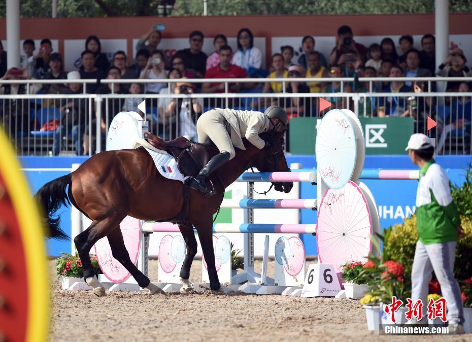 10月20日,第七届世界军人运动会马术场地障碍个人赛在湖北省武汉市举行,身着军装的各国男女骑手同场竞技,驾驭宝马跨越障碍。图为法国骑手勒·格黑·德·拉·萨尔(le Grix de la Salle)的赛马在一处障碍前出现拒跳。中新社记者 侯宇 摄