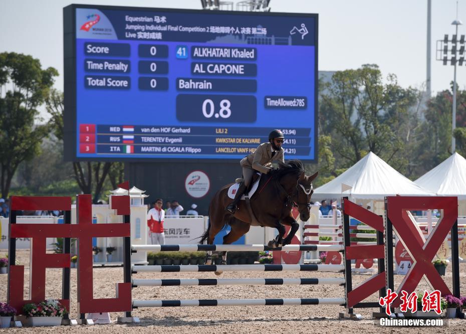 10月20日,第七届世界军人运动会马术场地障碍个人赛在湖北省武汉市举行,身着军装的各国男女骑手同场竞技,驾驭宝马跨越障碍。图为巴林骑手哈立德·阿尔卡塔里(Khaled Alkhatari)在比赛中。中新社记者 侯宇 摄