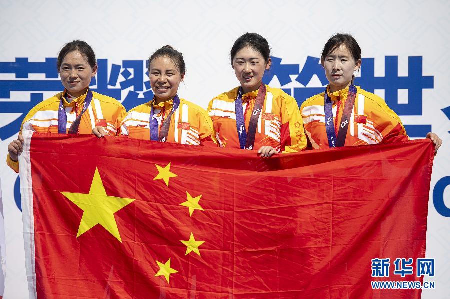 10月20日,中国队选手梁洪玉、普译娴、孙佳君、赵茜沙(由左至右)在颁奖仪式上。 当日,在武汉举行的第七届世界军人运动会公路自行车女子公路团体决赛中,中国队以4小时05分46秒的成绩获得金牌。 新华社记者熊琦摄