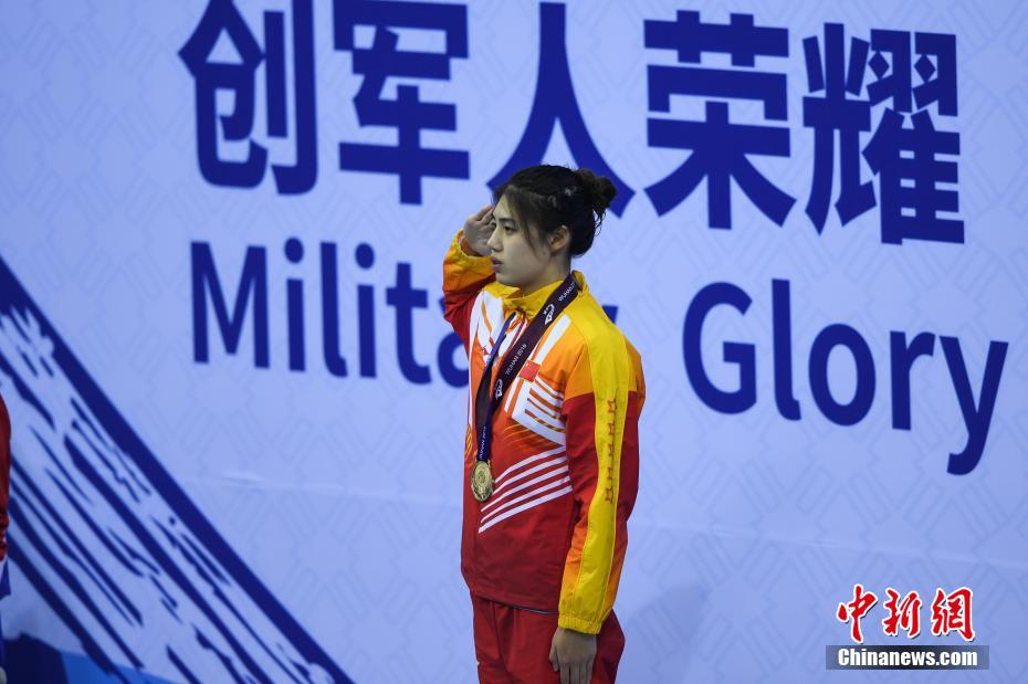 10月20日,第七届世界军人运动会游泳比赛女子100米蝶泳决赛在湖北省武汉市举行,中国选手张雨霏以58秒59的成绩夺得冠军。图为张雨霏在颁奖仪式上。中新社记者 何蓬磊 摄