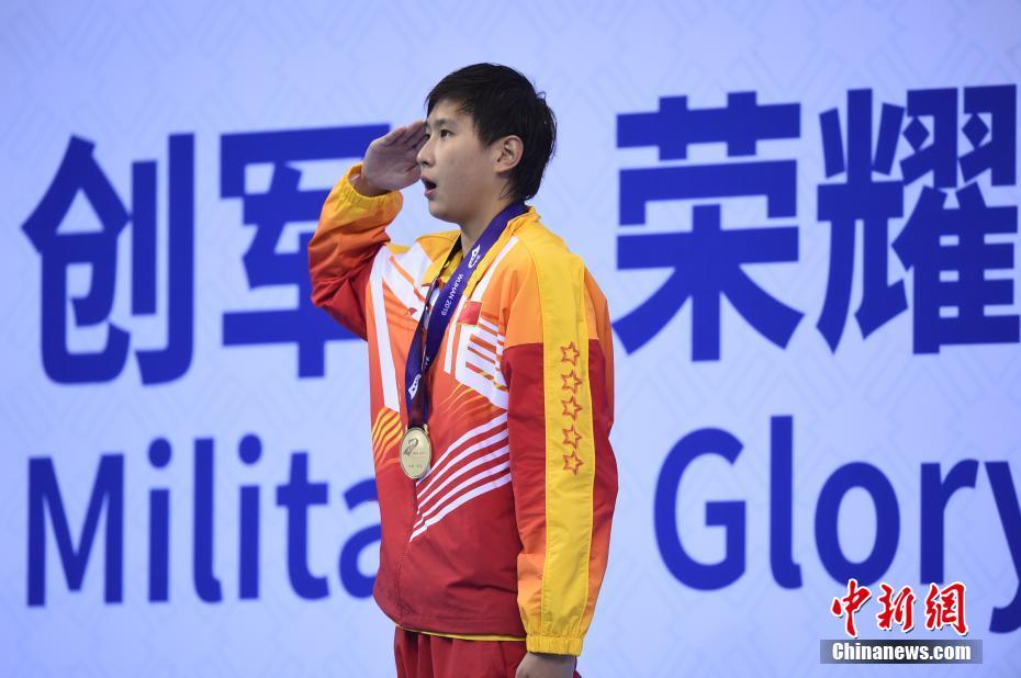 10月21日晚间,第七届世界军人运动会9项游泳决赛在湖北省武汉市举行,中国队获得7个项目冠军,其中打破了女子100米自由泳、男子200米自由泳、女子100米仰泳、男子400米混合泳和男女4x100米自由泳接力5个项目的国际军事体育理事会纪录,创造了女子1500米自由泳的国际军事体育理事会纪录。图为王简嘉禾在颁奖仪式上。中新社记者 侯宇 摄