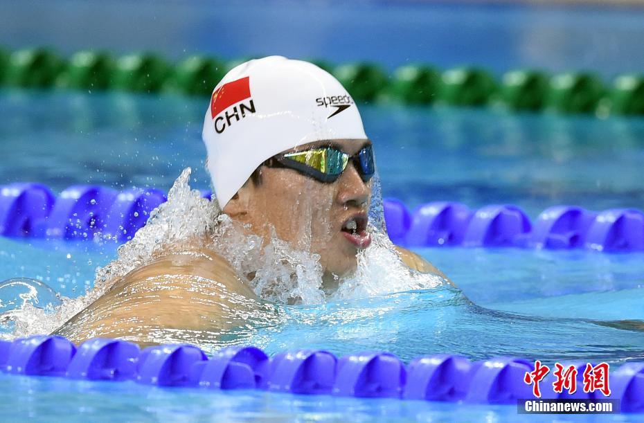 10月21日晚间,第七届世界军人运动会9项游泳决赛在湖北省武汉市举行,中国队获得7个项目冠军,其中打破了女子100米自由泳、男子200米自由泳、女子100米仰泳、男子400米混合泳和男女4x100米自由泳接力5个项目的国际军事体育理事会纪录,创造了女子1500米自由泳的国际军事体育理事会纪录。中国选手汪顺以4分10秒13的成绩获得男子400米个人混合泳冠军,并打破国际军事体育理事会纪录。图为汪顺在比赛中。中新社记者 侯宇 摄