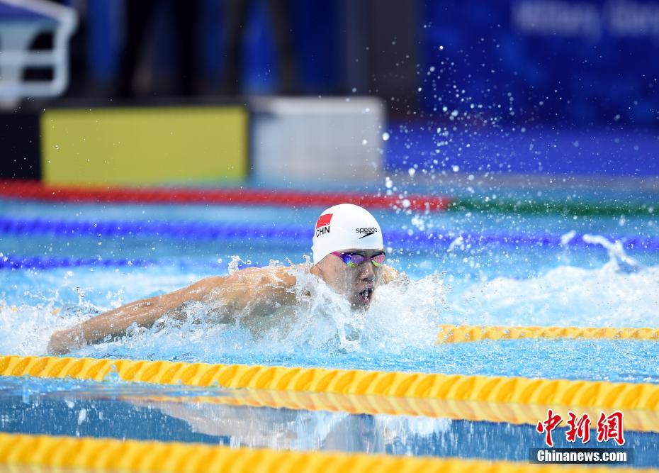10月21日晚间,第七届世界军人运动会9项游泳决赛在湖北省武汉市举行,中国队获得7个项目冠军,其中打破了女子100米自由泳、男子200米自由泳、女子100米仰泳、男子400米混合泳和男女4x100米自由泳接力5个项目的国际军事体育理事会纪录,创造了女子1500米自由泳的国际军事体育理事会纪录。中国选手覃海洋获得男子400米个人混合泳亚军。图为覃海洋在蝶泳泳姿比赛中。中新社记者 侯宇 摄