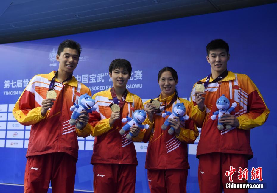 10月21日晚间,第七届世界军人运动会9项游泳决赛在湖北省武汉市举行,中国队获得7个项目冠军,其中打破了女子100米自由泳、男子200米自由泳、女子100米仰泳、男子400米混合泳和男女4x100米自由泳接力5个项目的国际军事体育理事会纪录,创造了女子1500米自由泳的国际军事体育理事会纪录。图为中国队季新杰、杨浚瑄、朱梦惠和何俊毅(左起)展示金牌。中新社记者 侯宇 摄