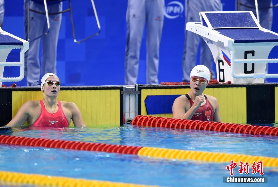 10月21日晚间,第七届世界军人运动会9项游泳决赛在湖北省武汉市举行,中国队获得7个项目冠军,其中打破了女子100米自由泳、男子200米自由泳、女子100米仰泳、男子400米混合泳和男女4x100米自由泳接力5个项目的国际军事体育理事会纪录,创造了女子1500米自由泳的国际军事体育理事会纪录。图为中国选手张雨涵(右)庆祝胜利。中新社记者 侯宇 摄