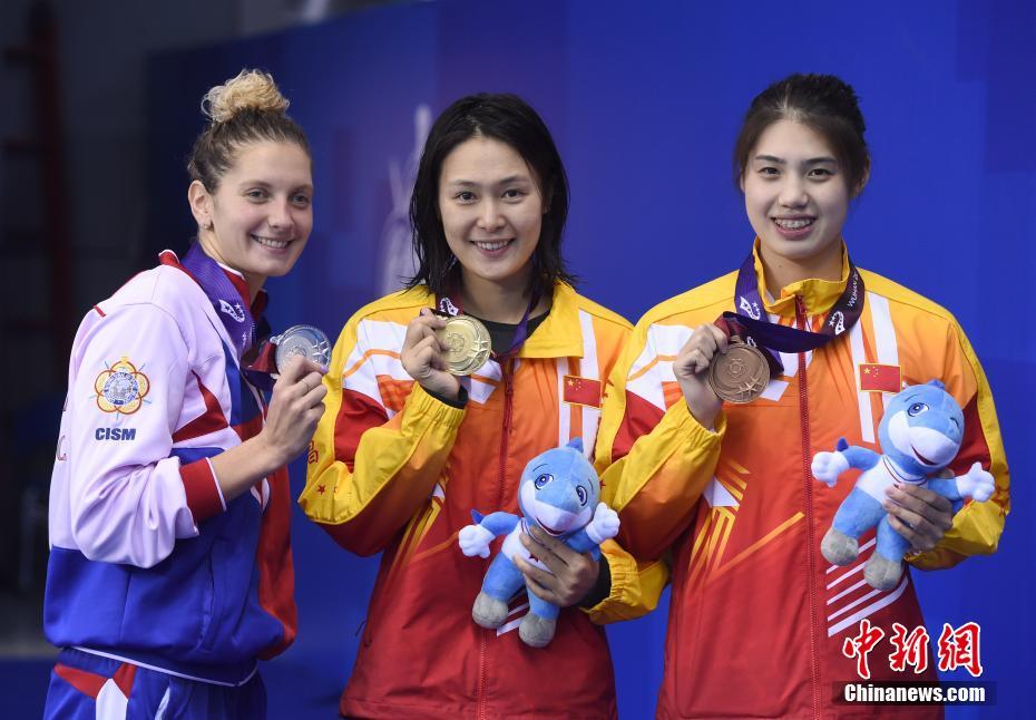 10月21日晚间,第七届世界军人运动会9项游泳决赛在湖北省武汉市举行,中国队获得7个项目冠军,其中打破了女子100米自由泳、男子200米自由泳、女子100米仰泳、男子400米混合泳和男女4x100米自由泳接力5个项目的国际军事体育理事会纪录,创造了女子1500米自由泳的国际军事体育理事会纪录。图为获得冠军的中国选手张雨涵(中)、获得亚军的俄罗斯选手齐穆洛娃(左)和获得季军的中国选手张雨霏(右)合影。中新社记者 侯宇 摄