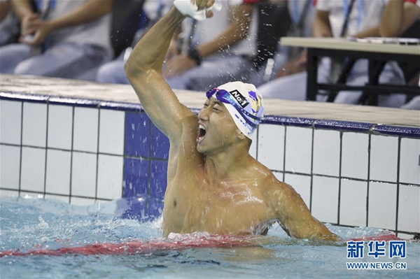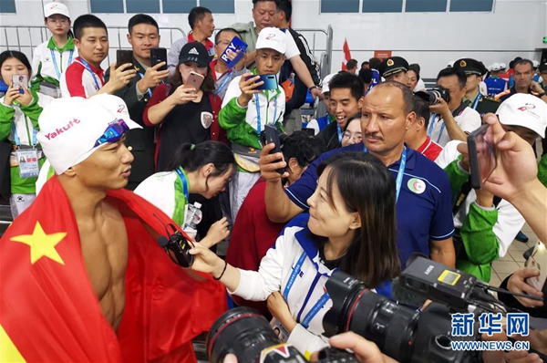 走出泳池,张政成了场上的“明星”,和几个队友拥抱击掌后,便立刻被众人围在中间。现场观众和其他运动员纷纷向他表示祝贺,人群中不时有人欢呼着“世界纪录!世界纪录!”。随后,激动的张政披着国旗,在泳池边跟家人、朋友合影,定格了这难忘的一刻。