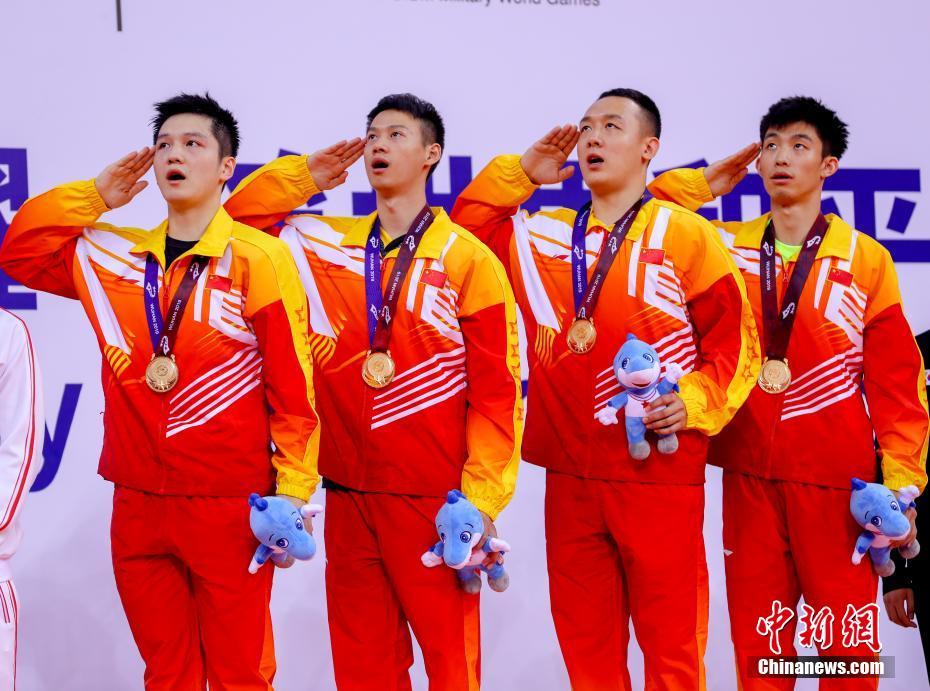 10月21日晚,第七届世界军人运动会乒乓球男子团体决赛在湖北省武汉市举行,中国队以3比1战胜朝鲜队获得乒乓球男子团体冠军。图为中国队获得男子团体冠军。中新社记者 张畅 摄