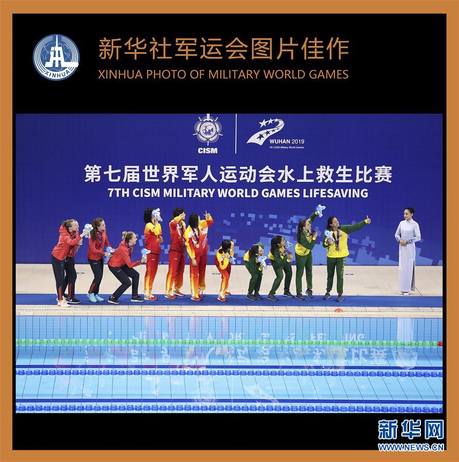 10月21日,冠军中国队(中)、亚军德国队(左)和季军巴西队在颁奖仪式后自拍。 当日,在武汉举行的第七届世界军人运动会水上救生项目女子4x25米运送假人接力决赛中,由胡一帆、吴慧敏、戴晓蝶、包雪怡组成的中国队以1分19秒02的成绩夺得冠军。 新华社记者王丽莉摄