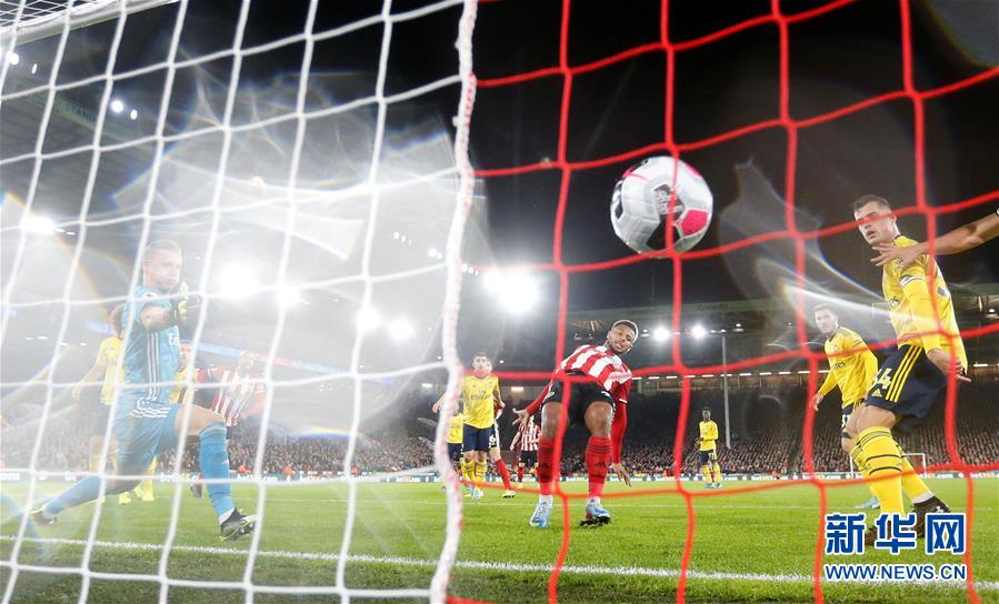 10月21日,谢菲尔德联队球员穆塞(右四)在比赛中破门。 当日,在2019-2020赛季英格兰足球超级联赛第九轮比赛中,谢菲尔德联队主场以1比0战胜阿森纳队。 新华社/路透