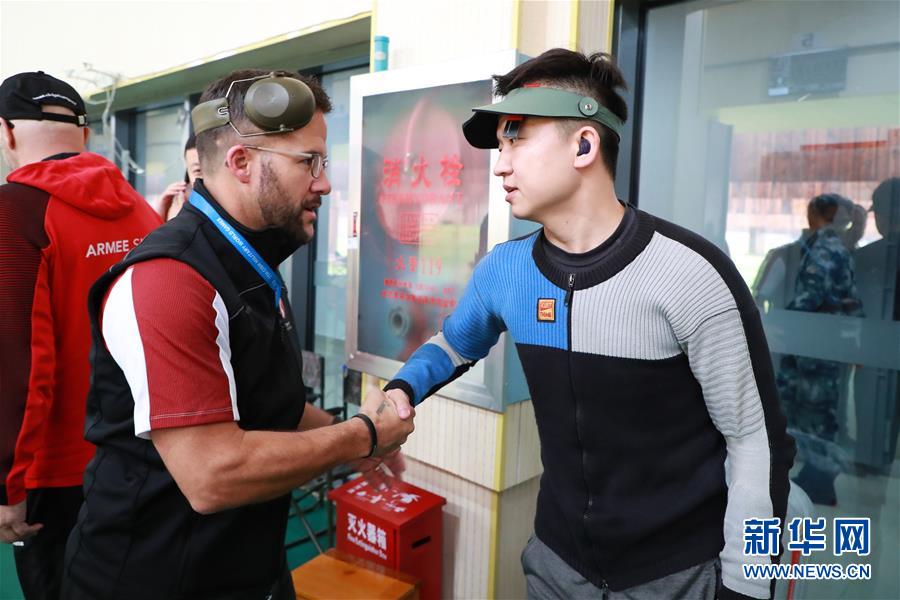 10月22日,中国选手惠子程(右)在比赛后接受祝贺。 当日,在武汉进行的第七届世界军人运动会男子300米标准步枪三种姿势个人赛决赛中,中国选手惠子程获得冠军。 新华社记者刘续摄
