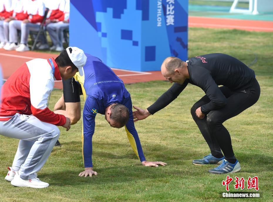 10月23日,第七届世界军人运动会海军五项赛事在湖北省武汉市拉开序幕。图为波兰男选手凯日科夫斯基(黑)赛后问候瑞典男选手奥埃德林格。