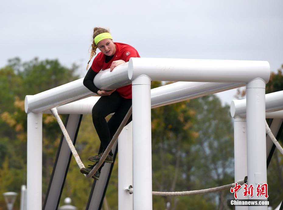10月23日,第七届世界军人运动会海军五项赛事在湖北省武汉市拉开序幕。图为丹麦女选手科尔曼挑战组合障碍。中新社记者 侯宇 摄